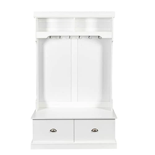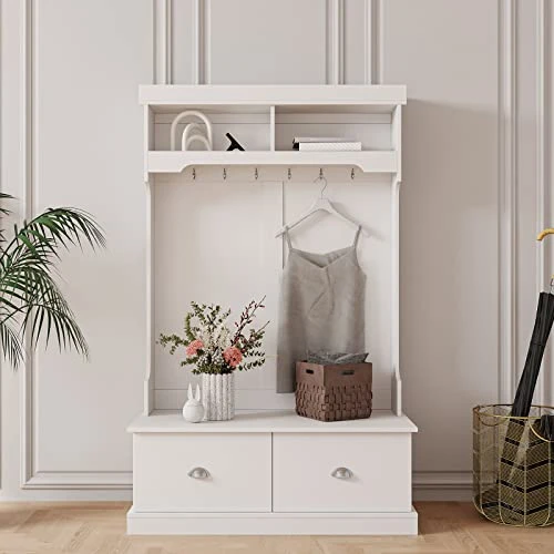 - 【Ample Stroage】The hall tree is not only just for hanging clothes, but also provides you with more storage space. Equipped with 6 metal hooks, 2 top shelves and 2 drawers, the hall tree with shoe bench will help you to organize your clothes, shoes, bags, hats, decorative ornaments and more daily essentials, keep your entryway or hallway clean and tidy.