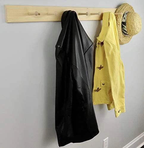 This is a 48″ unfinished pine coat rack. This coat rack has 8 shaker pegs. It is 3-1/2″ wide. The shaker pegs are 3″ long and are securely glued in place. No assembly required! It’s drilled for mounting and comes complete with screws, wall anchors and wood buttons to cover the screw holes. Choose the optional 4-1/2″ deep top shelf to place your additional items. Accessories not included. Each piece of wood has it’s own natural appeal and characteristics brought out by the grain, texture, knots, color and patterns. Item in picture may not look the same as the item you receive. Free shipping! Made in the USA!!