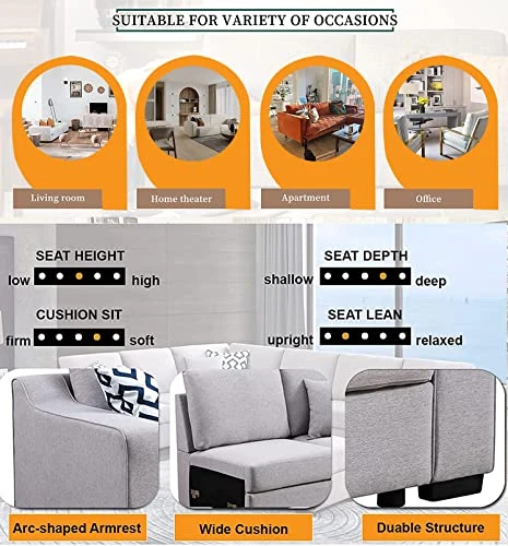 - Dimension of Fabric Sofa Couch: L Shape Couch size with 98.5″ x 125.5″, The armless couch can be freely placed on right or left side as your living position needs, each couch in 27″W x 22″D with 6.75″ thick cushion seat, 18″ backrest, 17.5″ from the floor to the seat, more spacious than others couches,more details,please refet to the picture we added