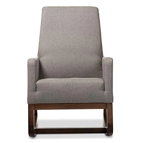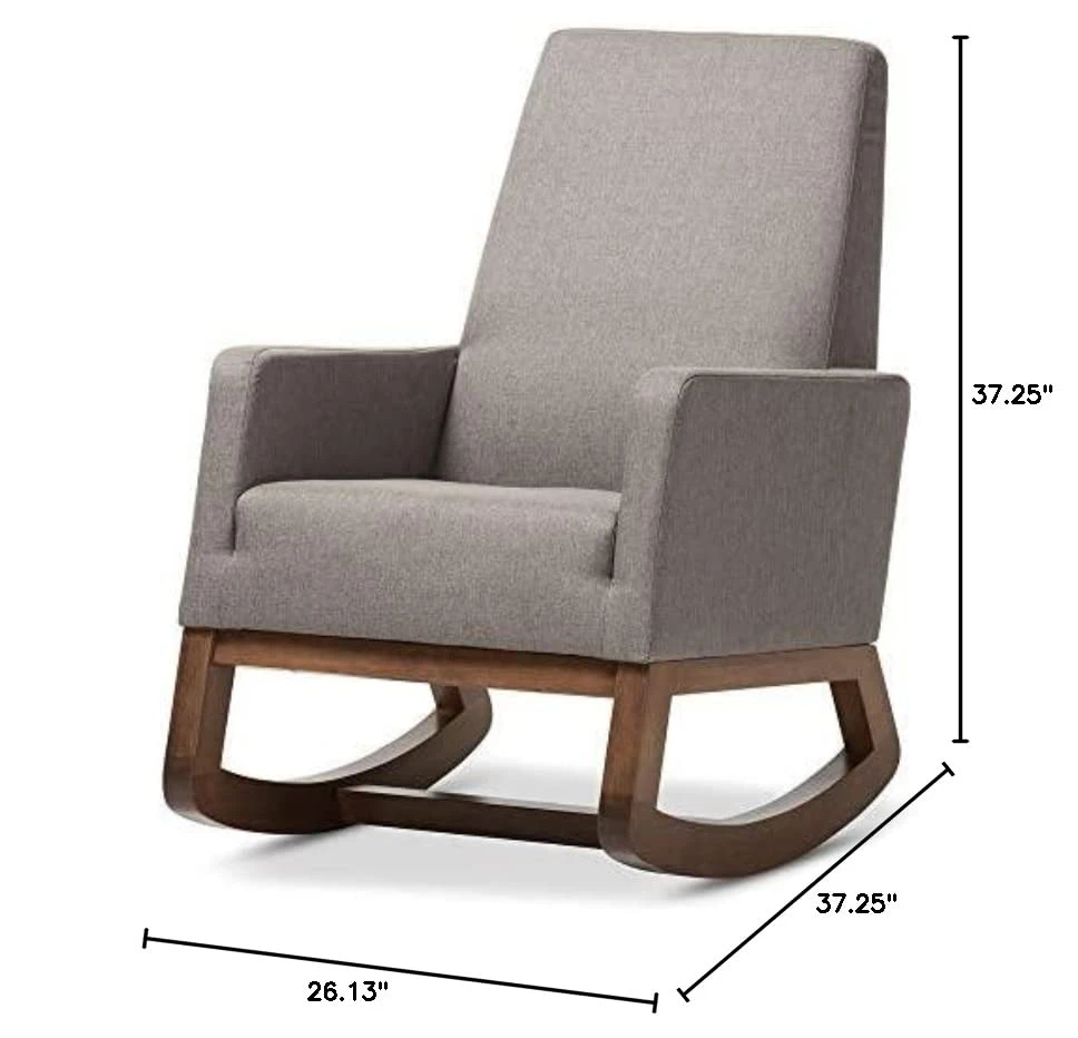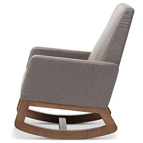 - Featuring polyester fabric in grey and a sturdy wood frame in a beautiful walnut finishing, this retro rocking chair feels right at home in a nursery, living room or any shared space