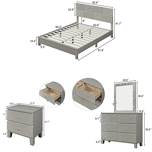 - [Champagne Silver] This bedroom set features a stunning champagne silver color that blends luxurious champagne and moonlight silver hues to create a classic yet trendy look. The boards have a fine corrugated finish, with additional silver details that add a touch of elegance to the overall design.