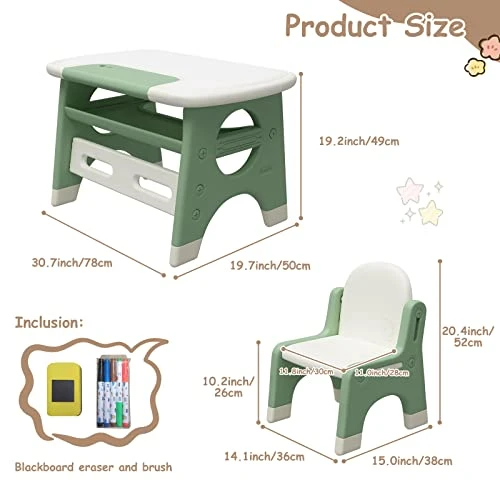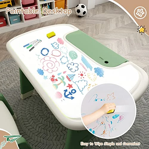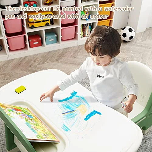 - Drawing Table with Erasable Desktop: Our table and chair set has a specially drawing top, children can freely draw with the watercolor pens included in the product on the desktop, and they can easily erase it with the attached blackboard eraser.