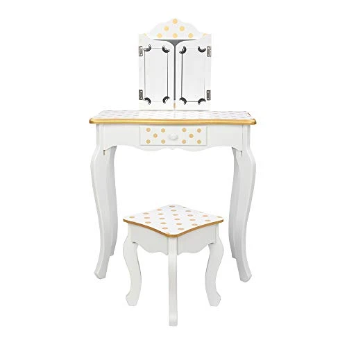 - FUNCTIONAL &STYLISH :This Pretend Play Kids Vanity Features Three-Pane Beveled Mirror Made Of Unbreakable Plexiglass For Better Reflect, A Pull-Out Center Drawer With A Knob Providing A Spacious Storage Area, Rounded Corner And Scalloped Legs On Both Table and Stool.