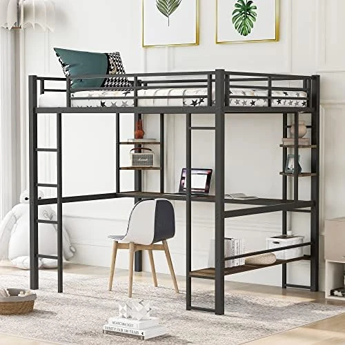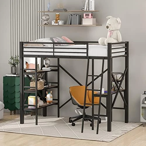 - 【Safety and Support】Metal loft bed with desk comes with high guardrail structure, which is used for preventing the child from falling from the loft bed and provides all-round protection. and there is 21 secured heavy-duty metal slats that provide ample support, stability and air circulation for the mattress (no foundation or box spring needed).