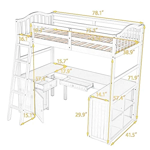 - [Versatility galore] The space underneath the twin size loft bed is a good place for you to read, do homework or play and create their own world to be explored. Coming with drawers, spacious bookshelves, cabinet and desk, the loft bed helps to store books, display decorations, or to place a laptop.