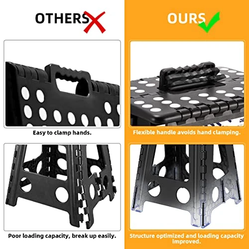 - 【Premium Quality 】The internal structural design 16 inch Folding Stool in Black is unique makes the step stool extra strong and safe. It can hold up to 400 lbs Max !!! Which is mainly used for adults indoor sitting. Please make sure the step stool is fully opened before use.