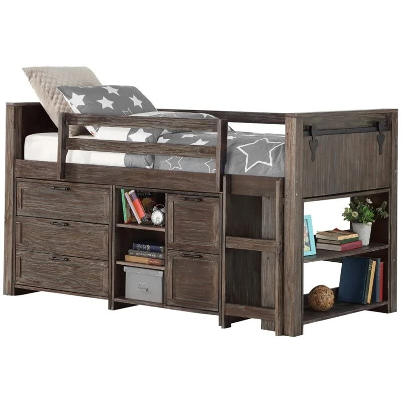 - Your Donco Kids purchase includes one Barn Door Low Loft with two and three drawer chests and a bookcase in Brushed Shadow| Tools and hardware included | Mattresses and bedding not included