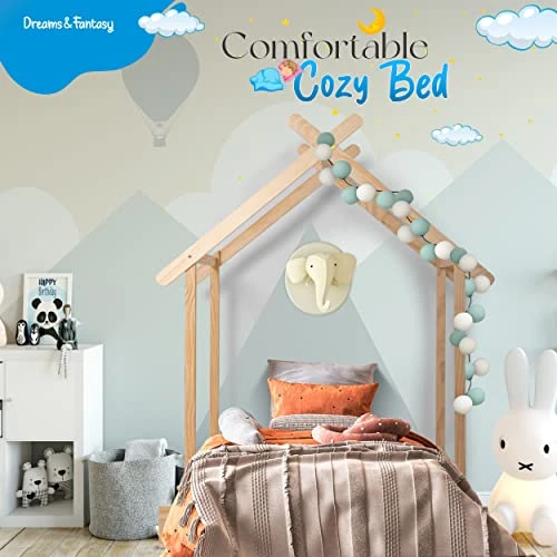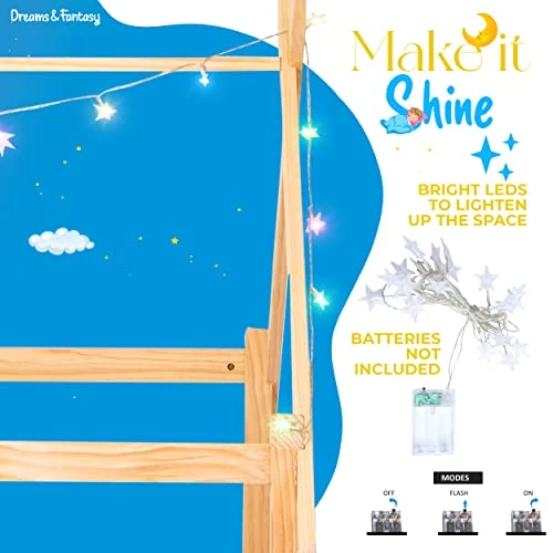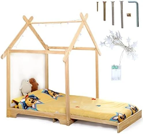 - BUILT-IN LIGHTS FOR COLORFUL BEDROOM | This kids floor bed adds some warm lighting and glow to your child’s bedroom with a 2 meter cord of star-shaped LED lights, included with this house bed frame. These are easy to string up and are perfect for cozy reading time or play.