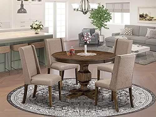 - DINING ROOM TABLE SET FINISH: Our modern kitchen table features are Distressed Jacobean Round Table Top and Distressed Jacobean Pedestal Legs. The kitchen chairs have included a Dark Khaki Linen Fabric seat and Distressed Jacobean Wooden 4 Legs. We have colored our dining room set with a high quality finish that produces an attractive appearance in any dining area. Its versatile style will complement just about any decor in your home for many years to come.