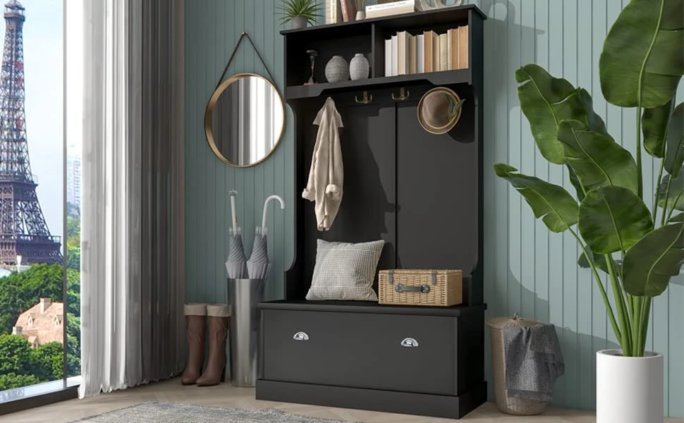 - [Durable Construction]: The entryway bench with storage and coat rack is made of particle board, the painted back board and the melamine coated rest boards are sleek and easy cleaning. entryway hall tree drawers with slide rails are smooth to use.