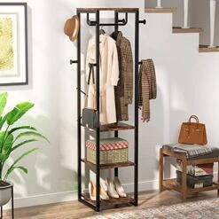 LITTLE TREE Freestanding Coat Rack With 4 Shelves And 8 Hooks For Entryway, Bedroom