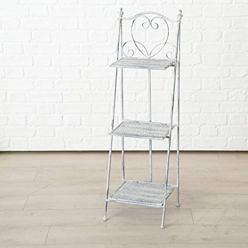 Strike the perfect balance of form and function with our Farmers Favorite Bakers Rack. This country-style iron rack features 3 fold out shelves that offers exceptional convenience by delivering fast, beautiful and easy storage. Designed with straight diagonal sides, this sturdy organizer features punched floral shelves, legs with knobbed bottoms and an elegant crest at the top shaped like a heart. Traditionally, racks like these were used to cool goods such as hot baguettes, pastries or pies in a bakery. Today, they are more popular than ever before for their versatile and easy going style. Please note: Punched floral pattern on shelves allows for plant drainage if needed. Well sized, this piece measures as follows: 11 3/4 L x 11 3/4 W x 38 1/2 H inches. Easy to set up, simply fold out the sides and place the shelves in the down position. Light weight at just over 15 pounds, it is a cinch to move. Crafted of durable iron, this set of metal shelves is hand crafted and is ideal in both indoor and outdoor settings. Finished with a rubbed shabby white finish over gray. Made by hand, each piece has delightful variations in the surface treatment. No two pieces are exactly alike. While treated weather resistant paint, this piece should not be left outside during extreme conditions. Create fabulous displays in any space. Organize plants, pile up books, blankets, towels, or whatever you fancy. There’s plenty of room here for all your treasures. Ideal for variety of styles, it pairs well with equal ease into beach, mountain, farm and urban chic themes. Welcome to the product line of Whole House Worlds. The New York based company offers high quality, stylish products for every room in the house, and beyond. From the kitchen, to the living room, to the bedroom, dining room, home office, closet and garden: Our criteria are comfort, quality, style and value.