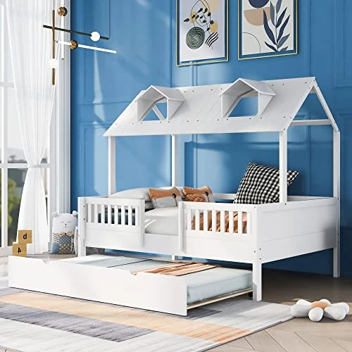 - [Full Size House Bed with Trundle] – Our full house bed with trundle is the perfect piece to accommodate guests or for family with several kids. It is easy to create that extra sleep space when needed with the pull-out trundle bed. Comes complete with thick slats to preserve the life of your mattress. (mattress not included).