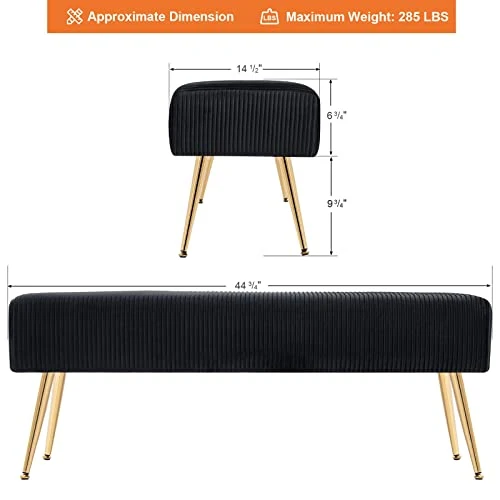 - 【FIRM CONSTRUCTION】This bedroom bench constructed from solid hardwood frame, supported by 4 sturdy metal legs;Dimension:44.75″L x 14.5″ W x 16.5″H; Maximum Weight: 285 LBS.