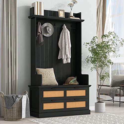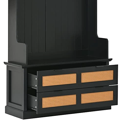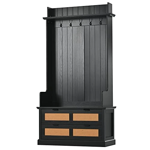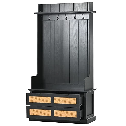 - [Entryway Coat Rack with Ample Storage Space]: Partition and the five hooks at the top are designed to accommodate umbrellas, pillows, potted plants, coats, hats, bags, while the two large rectangular drawers at the bottom provide a great storage space for many daily items. The bench serves as a place to remove shoes and also sit for waiting others.
