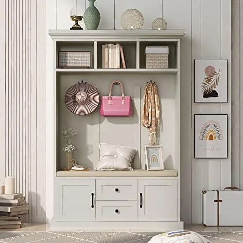 - [Easy Maintenance & Security Setting:]: About the maintenance of the hall tree, you just need to use a clean, damp cloth to simply wipe the units and then dry immediately with another clean cloth so that this hall tree use lifetime will be maximized. What’s more, Anti falling device is also considered in the design to avoid some accidental injuries in daily life.
