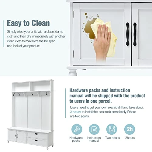 - Stable & Durable: This modern style hall tree adopts particle board and high-quality hardware to ensure the stability and durability. To ensure smooth touch experience, the surfaces of this hall tree are covered with stickers. And the anti-toppling fitting undoubtedly further enhances stability and ensure security in use.