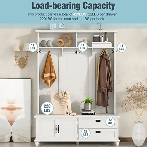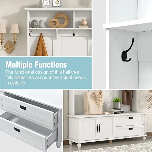 - Multiple Functions: The functional design of this hall tree fully takes into account the actual needs in daily life. In addition to the three hooks under the two top compartments, two hooks are placed on the sides for more storage needs. The bottom of this hall tree is juxtaposed with a cabinet and two drawers to accommodate all kinds of items. And the wide bench is a wonderful place to sit and change shoes.