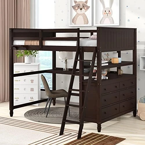 - 【What You Get】The full size wood loft bed set includes slat kit, with desk and 3 drawers, 2 tier shelves, a small shelf at the head and angled ladder, upper bed with full length guardrails. Ships in 3 boxes and is simple to assemble with clear instruction. If extra help is needed, don’t hesitate to contact our friendly customer service representatives