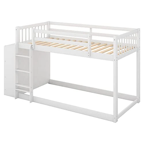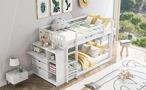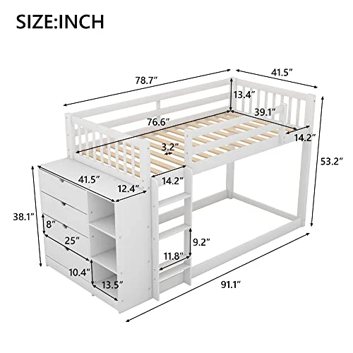- [Storage Space] Attached four drawers and three shelves offer stowaway space for clothes and bedtime stories. Functional and aesthetic, this bunk bed will enhance any bedroom.