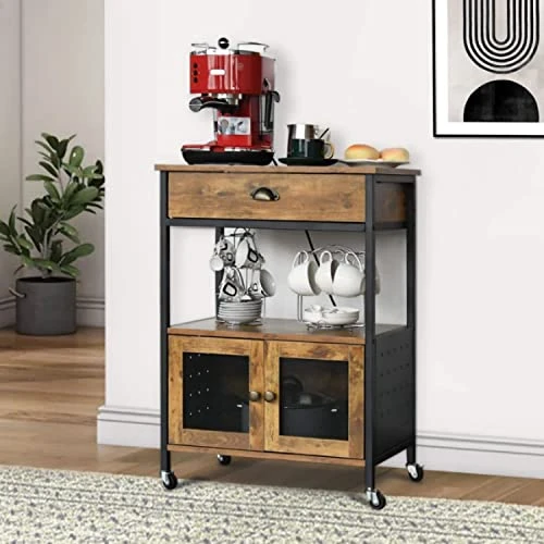 - STURDY & EASY TO CLEAN—This coffee cart uses the design language of iron and wood structure, the structure is strong and the surface is smooth and easy to clean. The door of the coffee station is made of wire mesh with dustproof function, so you don’t have to worry about the dust damage.