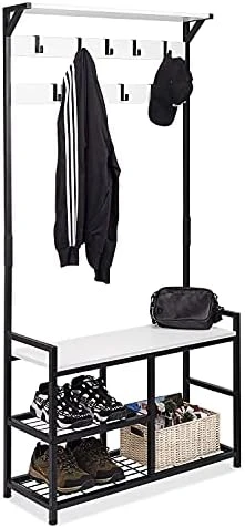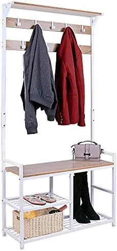 - [ Movable Hooks ] Our hall tree with bench and shoe storage includes 9 hanging hooks and 2 shelves. All the hooks on our hall tree is movable, and you could adjust them to any position you like for organizing various clothes, caps, bags and etc.
