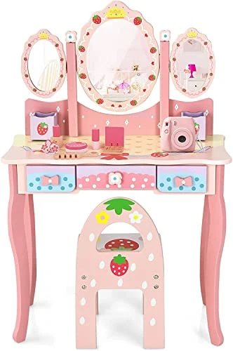 - 🍓【Tri-Folding Oval Real Glass Mirror】Coming with a 3-panel oval mirror and a matching vanity stool, this kids vanity set enables kids to sit comfortably while having a clear reflection when doing their hair or makeup. In addition, the 2 side mirrors can spin 180° and the middle mirror can spin 360°, which is convenient for kids to adjust the angle at their preference.