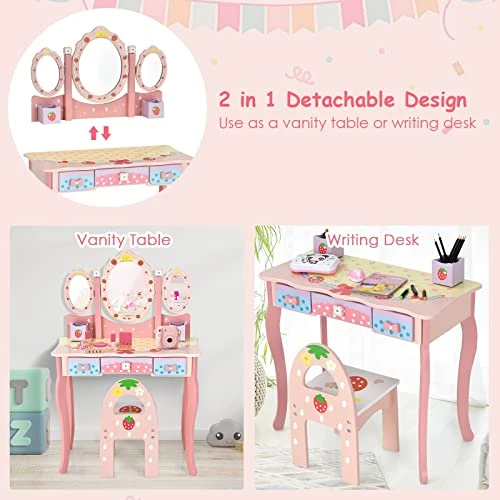 - 🍓【Detachable Mirror & Ample Storage Space】 The girls vanity set can be separated into two parts. After removing the top part, the girl makeup dressing table can also be used as a writing desk for kids. Besides, 3 drawers and 2 small storage holder can store their beloved jewelry, cosmetics, brushes, etc for roomy dressing or studying area for your kids. Notice: The storage holders on the table can be detached.