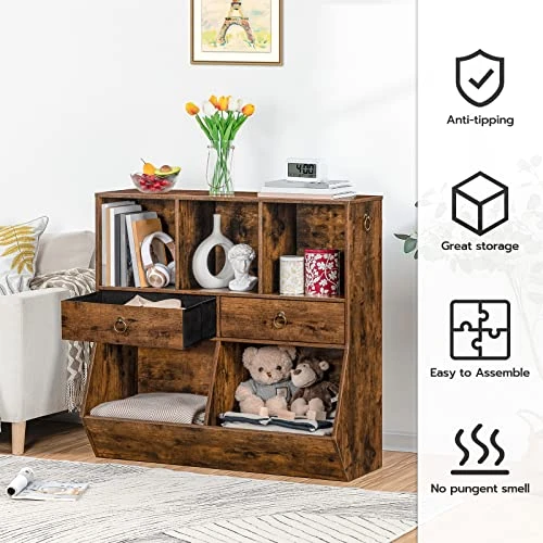 - Easy to Organize: This kids bookcase has 5 compartments to display toys or books and 2 drawers with pull rings are breezy to open and close for kids’ privacy. Furthermore, the 2 drawers can be detached and folded according to actual needs, leaving more open storage space. The top is an extra area for photos, trophies and collectibles