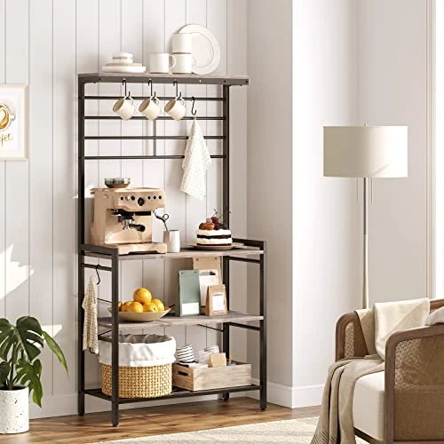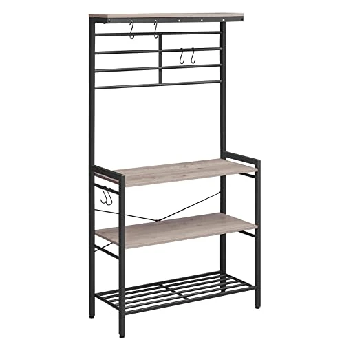 HOOBRO Kitchen Baker’s Rack, Kitchen Microwave Oven Stand With High Display Shelf, 2 Wooden Shelves And Mesh Panel, Kitchen Island Rack With 6 Hooks, Adjustable Feet, Greige And Black BG01HB01
