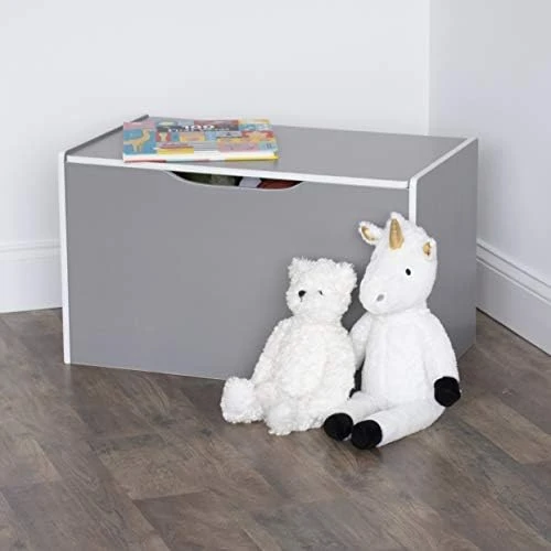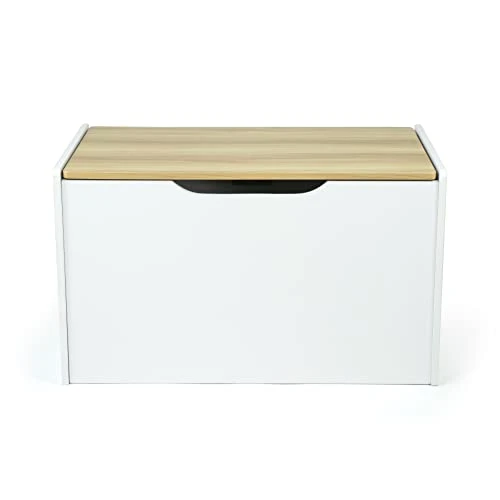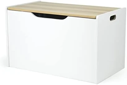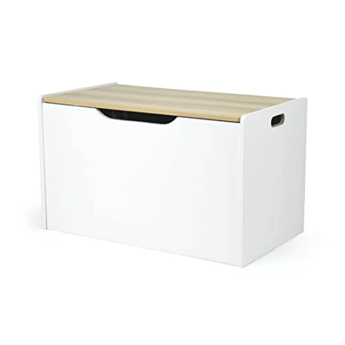 - Large toy box features a deep, easy-to-access storage compartment with hinged lid equipped with safety-close engineering.