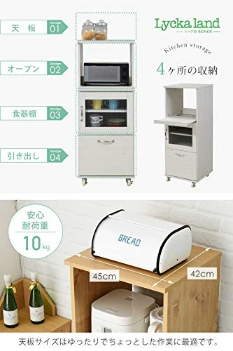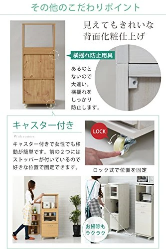- Movable Shelves: 1 piece / Cosmetic on the back / 4 casters (2 stoppers each); Range board with shelves for convenient storage in the kitchen gaps Low type with wheels for easy transportation; Can also be used as household appliances such as rice cookers and microwaves, so it can also be used as appliance racks. Available in white and natural colors with wood grain