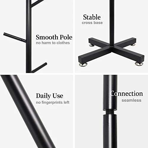 - 【Dimensions】: Coat rack: 67 inches (H); Cross base: 12.2 inches x 16 inches; Tube diameter: 1 inch. Includes 7 hooks. Each hook can hold up to 13 pounds, with a total load of up to 88 pounds. Four rubber feet can be adjusted in height for balancing positions.