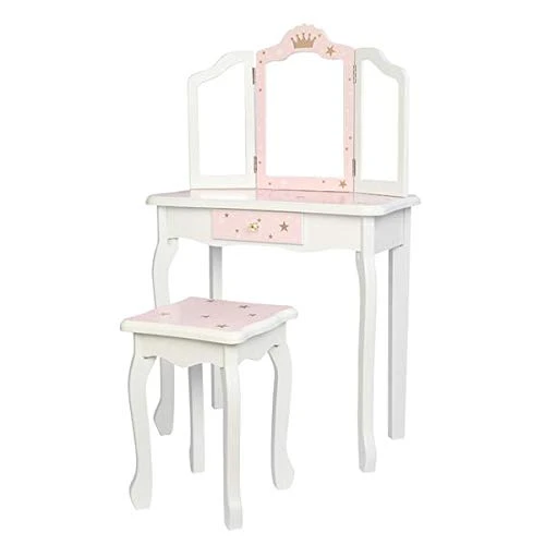 This is Wooden Toy Children’s Dressing Table. This dresser is made of high quality MDF board, which accentuates the super quality of the dressing table. Pink star style make this dresser sweet and lovely. The dresser top and stool surface all adopt arc design for avoid children knock against to cause unnecessary injury. The three-fold mirror can be detachable and used as a children’s desk.