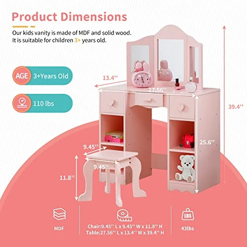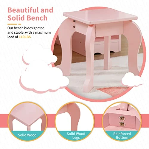 - 💕Safe and Stable: This girl vanity set with mirror is made of MDF and solid wood with a reinforced bottom of the table and chairs designed to be more stable. Our girls vanity set is made of odorless natural lacquer to give a safer experience to the little princess.