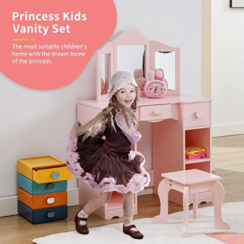 - 💖Lots of Storage Space: A kids vanity set with three drawers and four storage shelves, and a spacious pendulum table to meet all your child’s storage needs. The kids makeup vanity can be placed on the table of commonly used cosmetics, toys, ornaments, etc. Three drawers with pull handles are convenient for storage and can develop children’s ability to sort and organize. Four storage shelves can be placed books, toys, ornaments, etc.