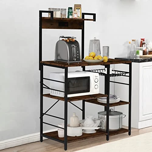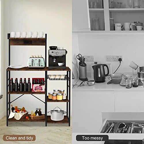 - Large capacity: The iron mesh rack can hold the cleaned water cup for easy drying. 6 S-shaped hooks can hang cups, spoons, gloves and other supplies. The tabletop is capable of accommodating an oven, coffee maker and toaster, and also features a pull-out basket drawer, which is perfect for storing fruits, vegetables and kitchen tools.