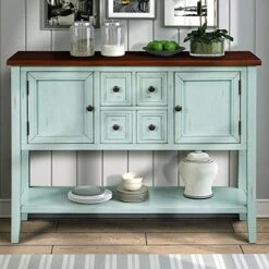 P PURLOVE Console Table Buffet Table With Storage Drawers Cabinets And Bottom Shelf (Antique Blue)