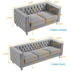 Mellow Adair Mid-Century Modern Loveseat/Sofa/Couch With Armrest Pockets, Tufted Linen Fabric, Ivory