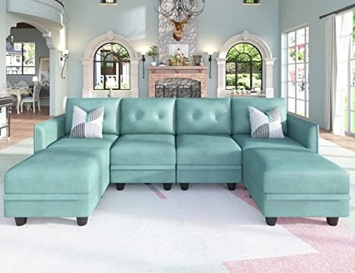 LLappuil Modular Sectional Sofa With Storage, Faux Leather Fabric 7 Seater Modular Sofa With Reversible Chaise, 112 Inch Convertible U Shape Sectional Couch With Ottomans, Aqua Blue
