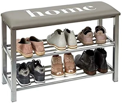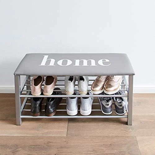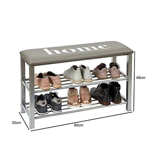 - Box contents: 1 shoe bench with 2 metal shelves and comfortable seat padding. Easy to clean – for men, women’s and children’s shoes – Colour: shiny metal, upholstery grey with lettering “home” – Dimensions: 80 x 30 x 48 cm (L x W x H)
