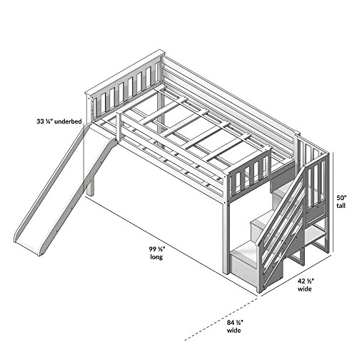 - Space-saving: loft design opens up floor space. Total footprint (including staircase and slide ) 99.5″L X 84.5″W X 50″H; Actual bed measurements excluding slide 99.5″L X 42.5″W X 50″H. At 50 inches high its ideal for low ceilings. Underbed height is 33.25 inches. Extra space for storage in built-in staircase shelves