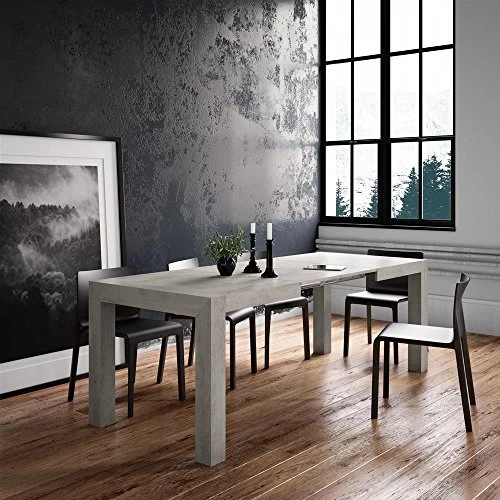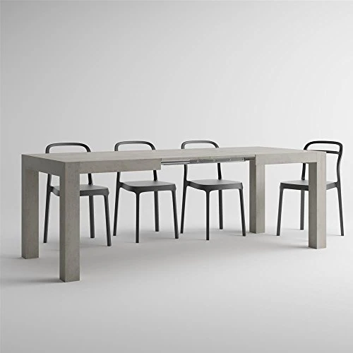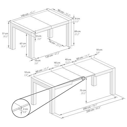 - MODERN TABLE: Extendable dining table. Min. length: 55.11 in. Features 2 extra leaves that reach a length of 70.86 or 86.61 cm (seats up to 10 people). The extension leaves can be stored under the table top. The continuity of the finish is NOT guaranteed