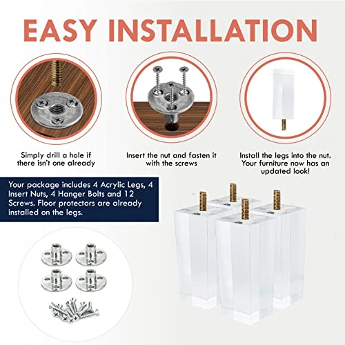 - EASY INSTALLATION: Your package includes 4 acrylic legs, 4 insert nuts, and 12 screws with pre-drilled 5/16” bolts so you can attach your new legs in under 10 minutes. Simply drill a hole if there isn’t one already, insert the nut and fasten it with the screws, and then tighten the screws. Your furniture now has an updated, refreshed look!