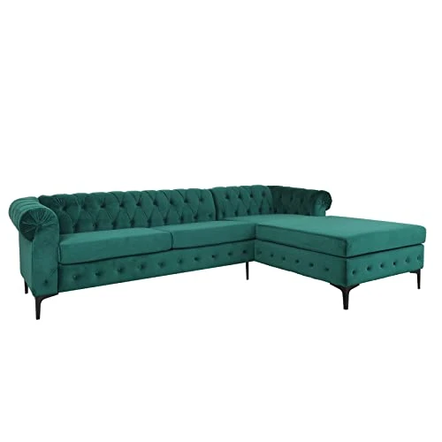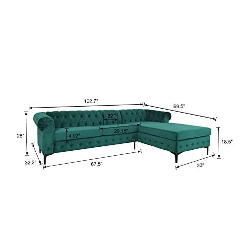 - MULTFUNCTIONAL COUCH: You can enjoy a cup of coffee or a read a book in the daytime, or have a good sleep at night, This L-shaped sectional couch with chaise lounge will create more opportunities for happy and relaxing times. With the deep button trufted velvet sofa, You ou can get a fantastic addition to your home for different purposes.