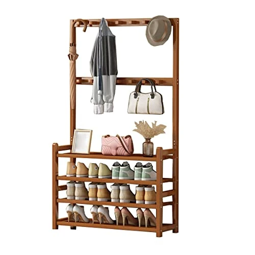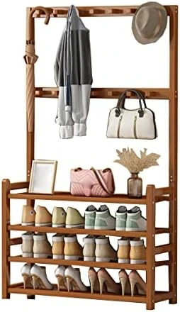 - Two-in-one design: two-row hooks and three-layer shoe rack combination. There are hooks above the coat rack for hanging jackets, coats, bags, hats, scarves and other items. There are 4 tiers of hangers below for shoes, storage boxes, tool boxes, etc.