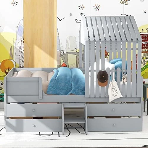 - Spacious Storage Space: The bed comes with four drawers under the bed frame that can store clothes, toys, books and other items. The drawers are easy to pull out and push in with smooth metal slides. The storage space helps to keep your kids’ room tidy and organized.