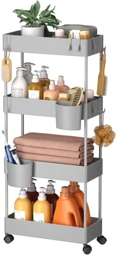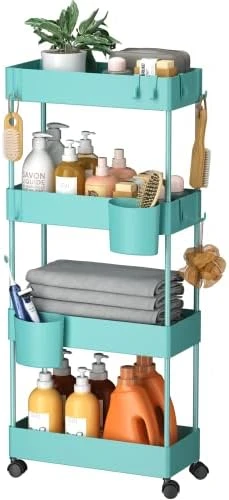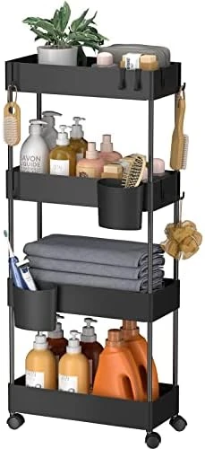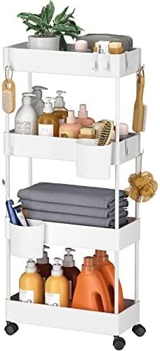 - Multiple Configurations: The 4-tier rolling bathroom cart can be assembled using all or some of the shelves as needed. The wheels of the slim storage cart are also optional allowing you to place it under a cabinet or counter.