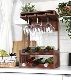 Mind Reader Floating Wine Rack, Wooden Storage Rack For 6 Bottles And 12 Stemmed Glasses, Natural Style Decor, Ideal For Home, Kitchen, Bar, Den, Brown