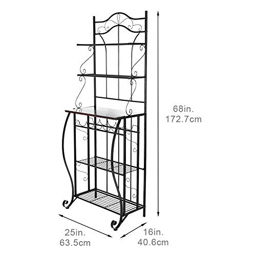 SSLine Modern Elegant Kitchen Baker’s Rack 68″ Tall Metal Microwave Oven Stand With Wood Top & Wine Stroage Shelf 5-Tier Carved Utility Shelving Unit Organizer For Kitchen Dining Room Laundry Room